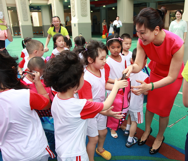在參觀園區(qū)時,翟美卿來到了正在唱歌、跳舞、做游戲的孩子們當(dāng)中,共同分享他們的快樂,孩子們還爭先向“翟媽媽”展示自己的畫作。翟美卿非常重視學(xué)前教育,本次慰問中為孩子們準(zhǔn)備了一份特別的禮物——香港ICAN全人教育。當(dāng)天,來自全人教育機構(gòu)的培訓(xùn)總監(jiān)陳瑞冰博士為老師和家長們帶來了一堂生動的“全人教育”課,這也是“全人教育”的第一講,翟美卿親臨現(xiàn)場進行體驗。