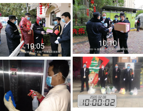 直面疫情,增城物業人無畏無懼,奮勇擔當。在住戶隔期期間,增城物業積極配合政府進行24小時的輪崗監控及安全巡查,并成立物資配送小組協助業主解決生活需求,安排管家專送服務。在疑似病例確診后,面對其他住戶的擔憂和強化防控的壓力,項目積極、迅速啟動緊急防疫方案,一方面用心解答客戶疑問、穩定住戶情緒,另一方面緊急對小區所有樓層、公共場所進行無死角、全方位的消毒殺菌工作(還專設臨時消毒屋進行防御),愛心接力協助自我隔離業主清理生活垃圾等,系列舉措得到了業主及政府部門的高度認可,也有效地控制了小區疫情的蔓延。