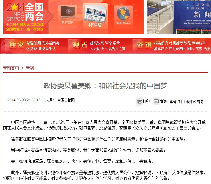 翟美卿在回答中國日報網記者關于“你的中國夢是什么”的問題時表示,和諧社會就是她的中國夢。