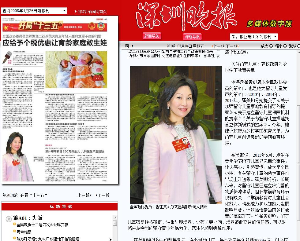 全國政協十二屆四次會議昨日開幕,在深的全國政協委員繼續發聲。昨日,深晚記者連線北京,專訪了全國政協委員、香江集團總裁翟美卿。翟美卿本屆兩會提交了4份提案,連續4年呼吁關注留守兒童問題,呼吁政府為鄉村學前教育兜底。另外,為減輕二孩家庭養育負擔,翟美卿還建議,給予生育家庭個稅優惠。