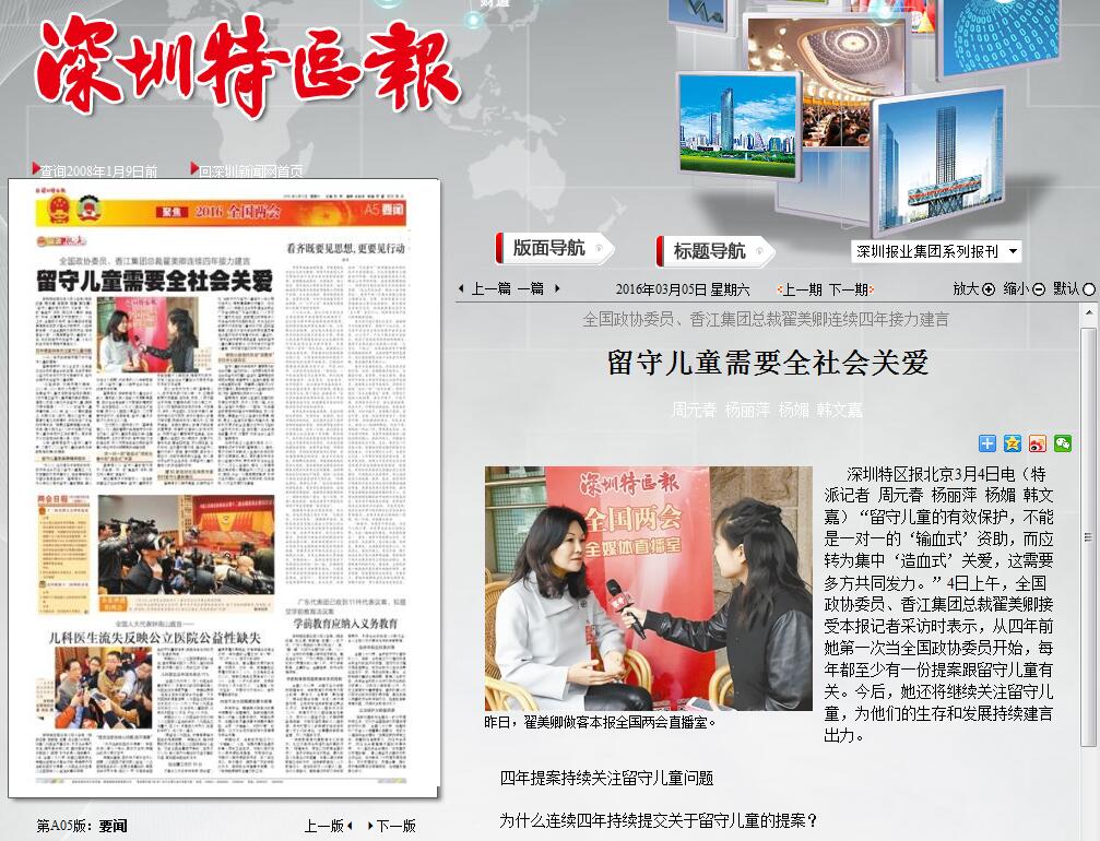 翟美卿表示,作為企業家,也是香江社會救助基金會的主席,她在平常的公益行動中與農村孩子接觸較多,自然會持續關注留守兒童問題。